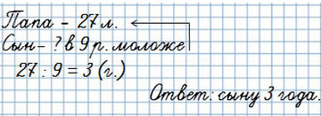 Папе 27 лет, а сын в 9 раз моложе папы. Сколько лет сыну?