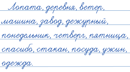 Л..пата‚ д..ревня, вет..р‚ м..шина‚ з..вод‚ д..журный, пон..дельник, ч..тверг, пятн..ца, сп..сибо, ст..кан‚ п..суда‚ уж..н‚ ..дежда.