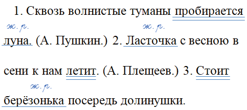 1. Сквозь волнистые туманы пробирается луна. (А. Пушкин.) 2. Ласточка с весною в сени к нам летит. (А. Плещеев.) 3. Стоит берёзонька посередь долинушки.