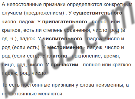 В «Справочных материалах» учебника даны планы морфологического разбора имени существительного, имени прилагательного, глагола, причастия, имени числительного, местоимения. Проанализируйте эти планы и объясните, в чём заключается отличие постоянных и непостоянных морфологических признаков самостоятельных частей речи.