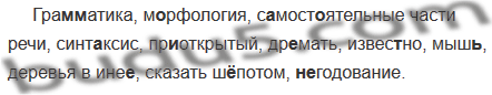 Гра(м, мм)атика, м..рфология, с..мост..ятельные части речи, синт..ксис, пр..открытый, др..мать, извес(?)но, мыш(?), деревья в ине.., сказать ш..потом, (не)годование.