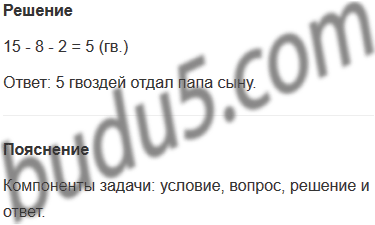 Задание № 17. Папа достал из ящика 15 гвоздей. Он прибил 8 гвоздями планку, 2 гвоздя забил в стену, а остальные отдал сыну. Сколько гвоздей отдал папа сыну?