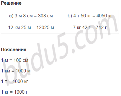 | а) 3 м 8 см = ... см | б) 4 т 56 кг = ... кг |