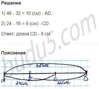 Задание № 10. На отрезке АВ отмечены точки С и D так, что точка С лежит между точками В и D. Известно, что АВ = 48 см, АС = 24 см, BD = 32 см. Найди длину отрезка CD.