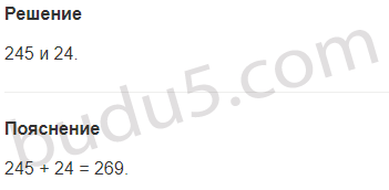 Задание № 14. Сумма двух чисел равна 269. Первое из этих чисел оканчивается цифрой 5. Если эту цифру зачеркнуть, то получится второе число. Найди эти числа.