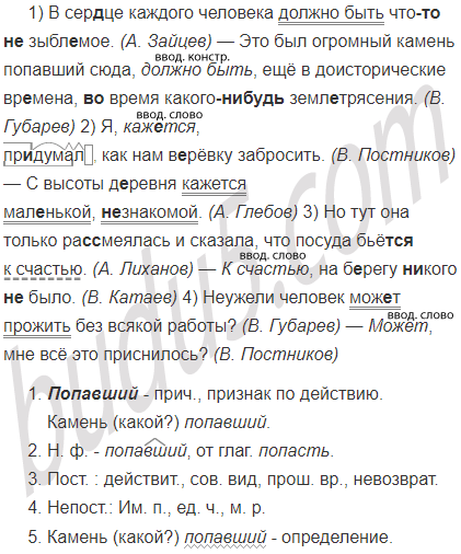 пр..думал2 как нам в..рёвку забросить. (В. Постников) — С высоты д..ревня кажется мал..нькой (не)знакомой. (А. Глебов) 3) Но тут она только ра(с, сс)меялась и сказала что посуда бьёт(?)ся к счастью. (А. Лиханов) — К счастью на б..регу (н..)кого (н..)было. (В. Катаев) 4) Неужели человек мож..т прожить без всякой работы? (В. Губарев) — Может мне всё это приснилось? (В. Постников)